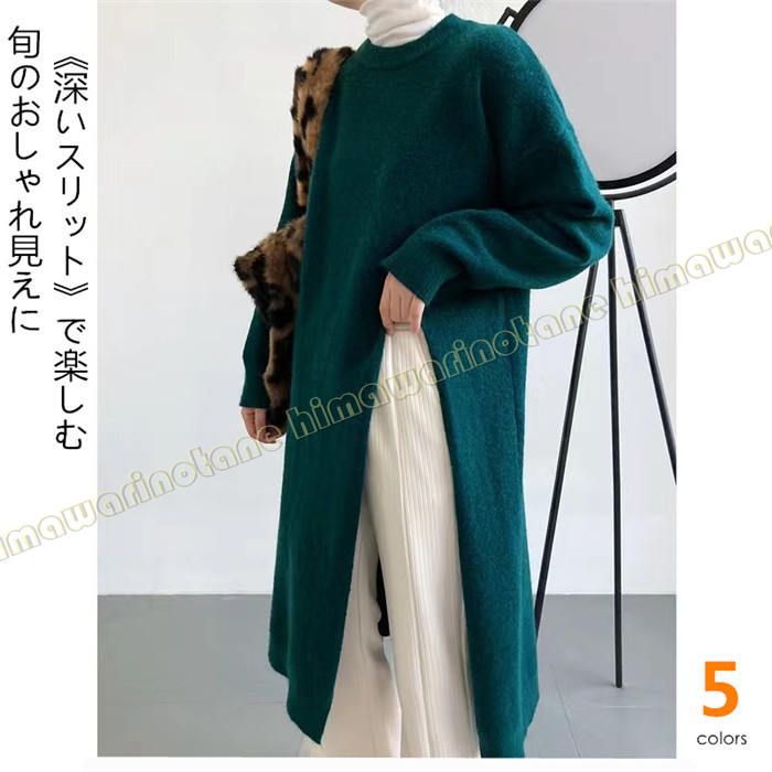 スリット ワンピース ニットワンピース レディース 秋冬 きれいめ クルーネック 長袖 厚手 サイド ハイウエスト ロング丈 マタニティ ゆったり 無地 インナー セーター ワンピース