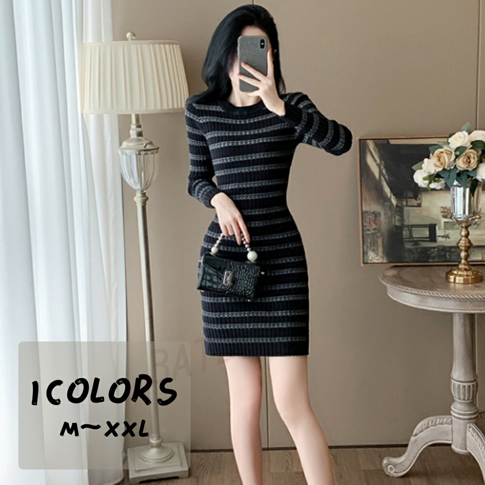 ニットワンピース 膝丈 秋冬 ニットワンピース ストライプ ニットインナー ファッション 長袖 セーター 着痩せ ゆったり 韓国風 カジュアル