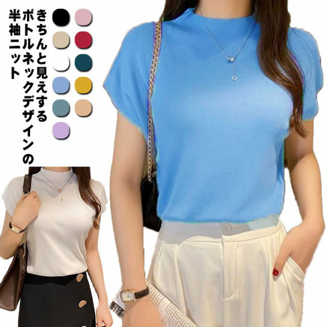 ボトルネック 春 秋 トップス ニット 半袖 夏 リブニット 薄手 プルオーバー フレンチスリーブ モックネック ハイネック カジュアル きれいめ レディース 無地 着回し フィット 涼しい サマーニ