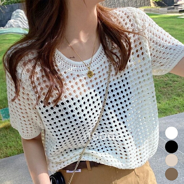 トップス レディース ニット 透かし編み 半袖ニット カットソー 夏 シャツ サマーニット メッシュ 透け感 きれいめ おしゃれ シンプル ゆったり 無地 フリー 20代 30代 40代 50代 レ