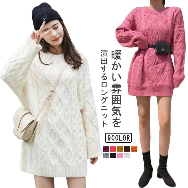 ロング丈 セーター ケーブル編み おしゃれ プルオーバー ニット レディース あったか カジュアル 長袖 体型カバー トップス 秋冬 チュニック ニット 着瘦せ ギフト 体型カバー クルーネック ボリ