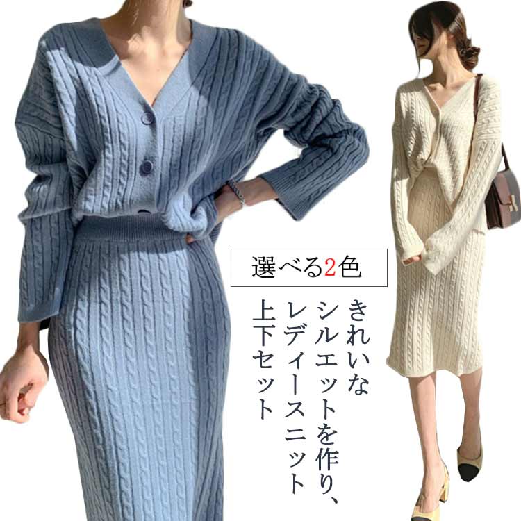 セットアップ 着回し 秋冬 セーター ニット ストライプ おしゃれ Vネック 上下セット 秋冬 無地 きれいめ ニットスカート トップス コーデしやすい シンプル 細見える 大人女性 同窓会 女子会