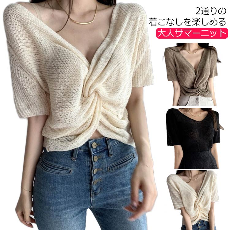 前後2way Vネック サマーニット 半袖 きれいめ 薄手 S~3XLレディースファッション トップス ニット セーター セーター