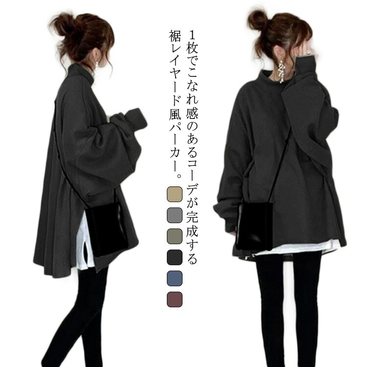 レイヤード風 バックフリル パーカー 長袖 スウェット パーカー ハイネック 重ね着 無地 ゆったり カジュアル