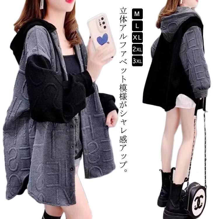 トレンドの型押し 立体柄パーカー ジャケット コート 長袖 アウター ボリューム袖 ビッグシルエット 暖かい 大人可愛い ラウンド裾 エンボス加工