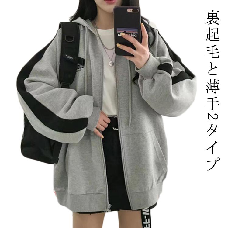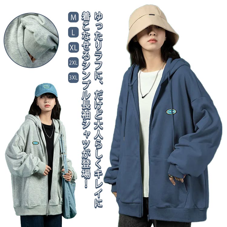 パーカー 可愛い 大きめ 春 薄手 ジップアップ 長袖 おしゃれ 韓国 スウェット トレーナー 大きいサイズ ゆったり フード付き 体型カバー オーバーサイズ レディース