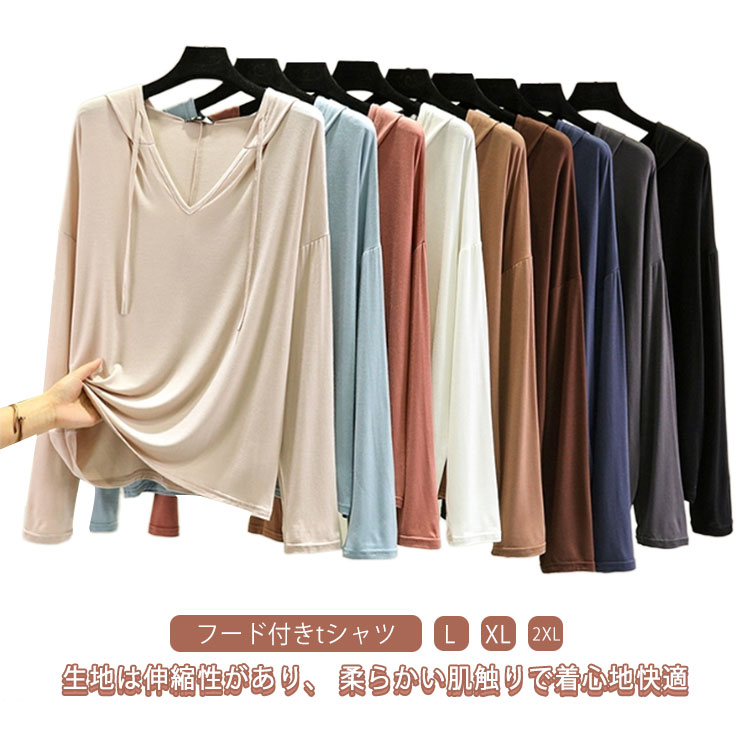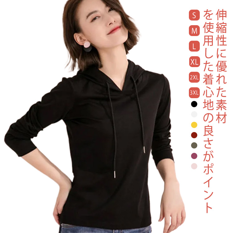 カジュアル レディース トップス フード付き tシャツ 長袖 春 カットソー プルオーバー 無地パーカー 薄手 伸縮性 ストレッチ 大きいサイズ 40代 春服 春物 ルームウエア 30代 パーカー
