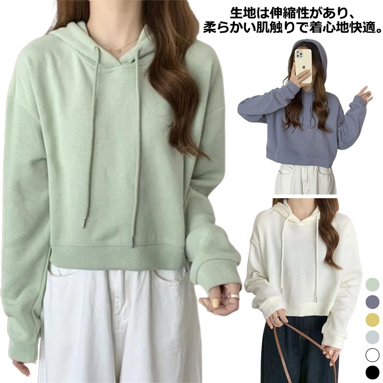 パーカー カジュアル tシャツ フード付き レディース 無地 薄手 春 プルオーバーパーカー 短め トップス きれいめ 長袖パーカー