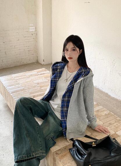 重ね着風チェック柄フードフーディートレーナー パーカートップススウェットポケット厚手長袖大きいサイズビッグゆったりダンス衣装ヒップホップレディースガールズストリート個性的韓国ファッション