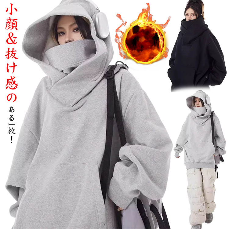 タートルネック フード付き プルオーバー パーカー 長袖 厚手 薄手 春秋冬 ビッグパーカー ポケット付き ボリュームネック 小顔 ユニセックス