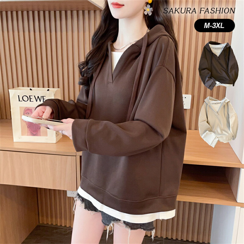 パーカー スウェット レディース トップス スエット トレーナー 長袖 長そで フード フーディー 裏起毛 裏フリース 重ね着風 防寒 コットン混 ゆったり 秋 無地 裏起毛フーディー