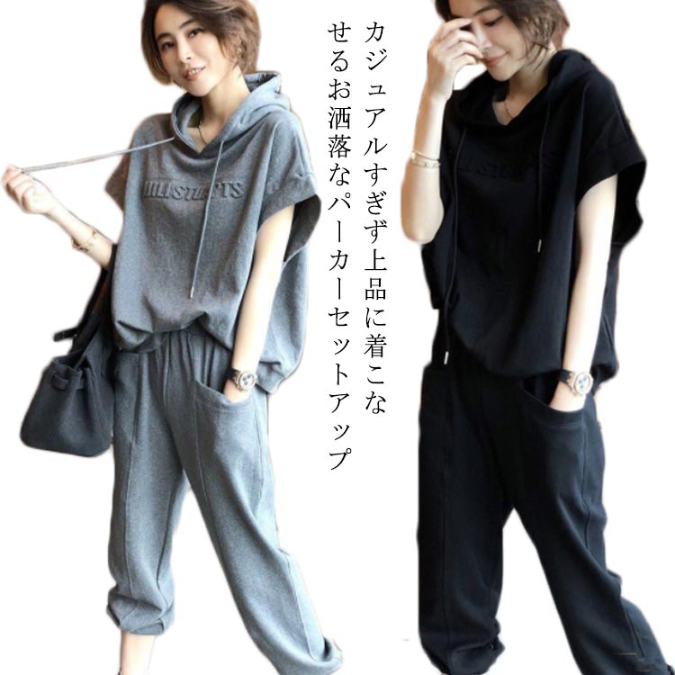ジャージ セットアップ 2点 半袖 ゆったり 夏 体型カバー カジュアル 上下セット レディース 夏 フード付き おしゃれ スウェットパンツ 無地 ギフト 着痩せ おしゃれ 春秋 大きいサイズ シンプ