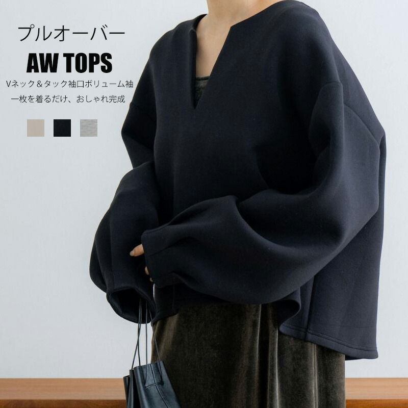 タック入りボリューム袖プルオーバー スウェット パーカー ショート丈 コンパクト 長袖 vネック 小顔 オシャレ 大人可愛い ライトアウター レイヤードトップス