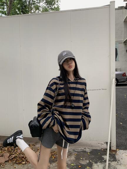 ボーダー柄フードフーディートレーナー パーカートップススウェットポケット長袖大きいサイズビッグゆったり長めダンス衣装ヒップホップレディースガールズストリート個性的韓国ファッション