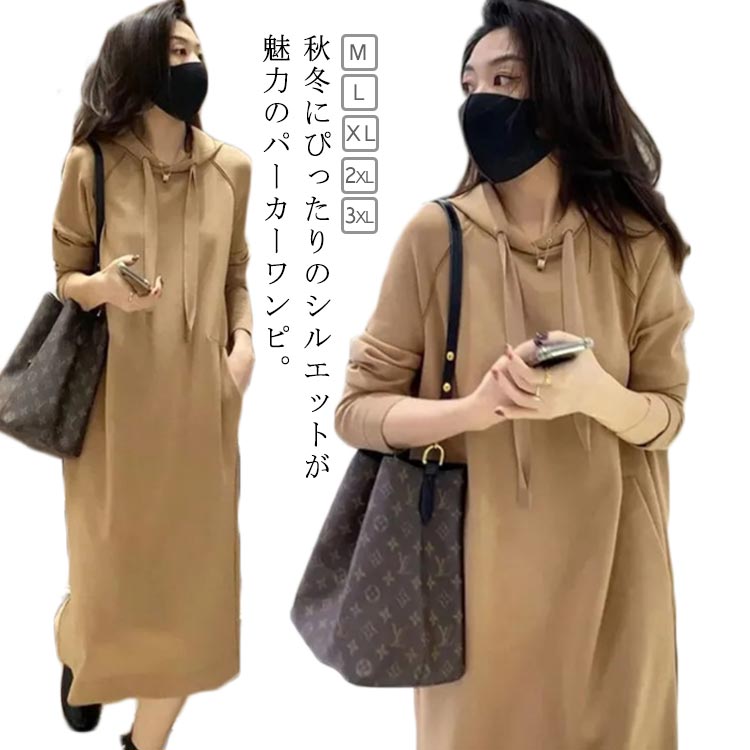 ポケット付き パーカーワンピース 着瘦せ 体型カバー マキシ丈 M~3XLレディースファッション トップス パーカー