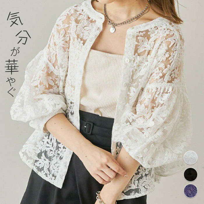 袖ポワン~ 総レース サマーアウター ホワイト ブラック パーブル 紫 白 黒 フリーサイズ 20代 30代 40代 50代 プレゼント 贈り物 ギフト 母の日 春