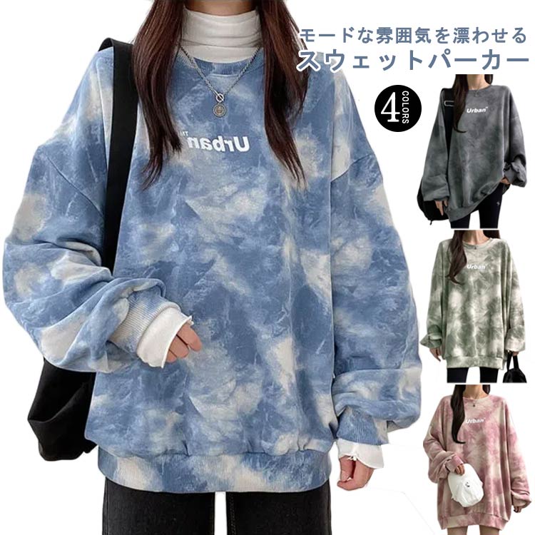 パーカー レディース ビッグシルエット スウェット 長袖 タイダイ染め 総柄 フードなし 体型カバー ゆったり おしゃれ
