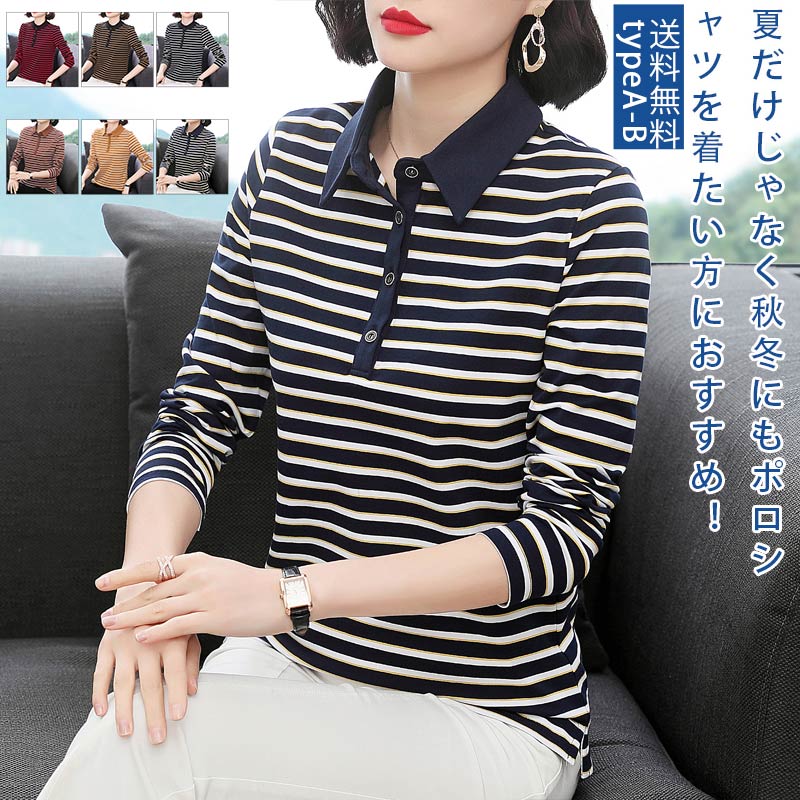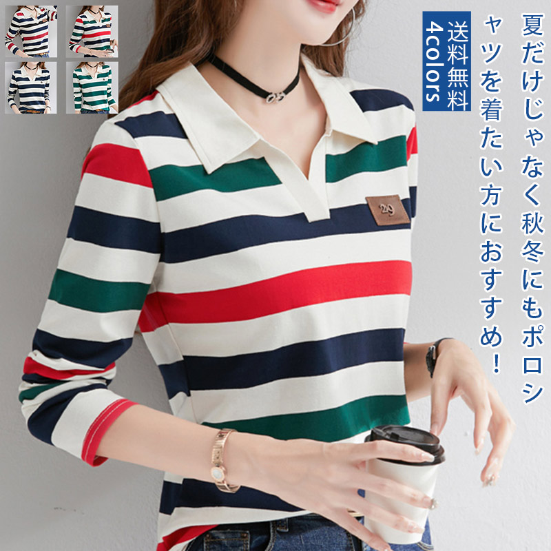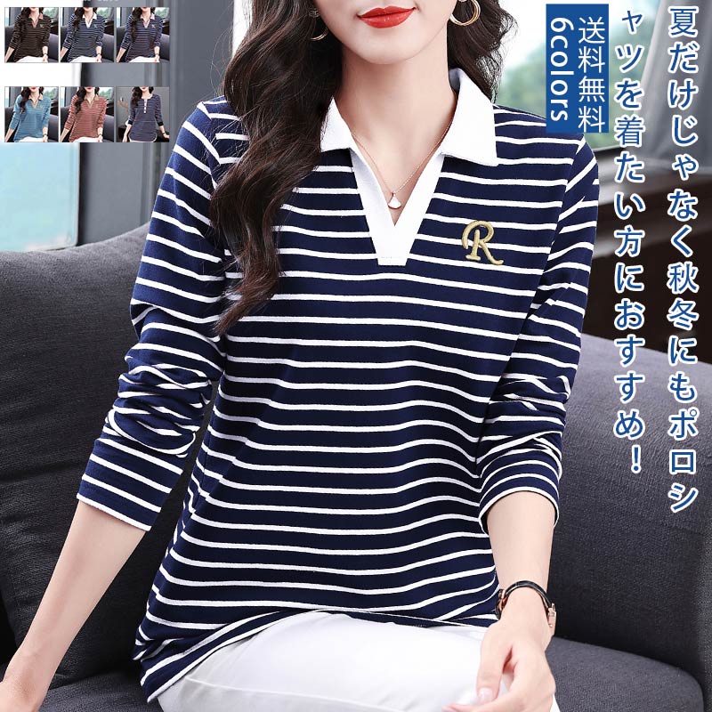 ポロシャツ レディース シャツ しま模様 着痩せ 体型カバー 長袖 ボーダー柄 ネック スポーツ トップス カジュアル 仕事 きれいめ オシャレ