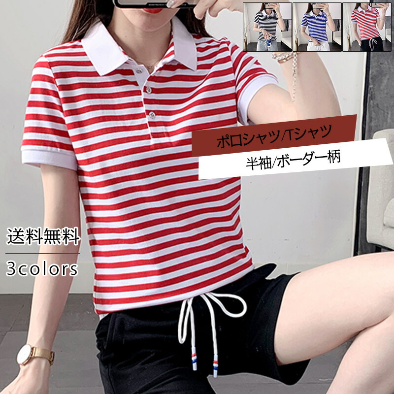 ポロシャツ レディース シャツ 半袖 ボーダー柄 ネック ボタン付き 着痩せ 体型カバー スポーツ トップス カジュアル 仕事 きれいめ オシャレ