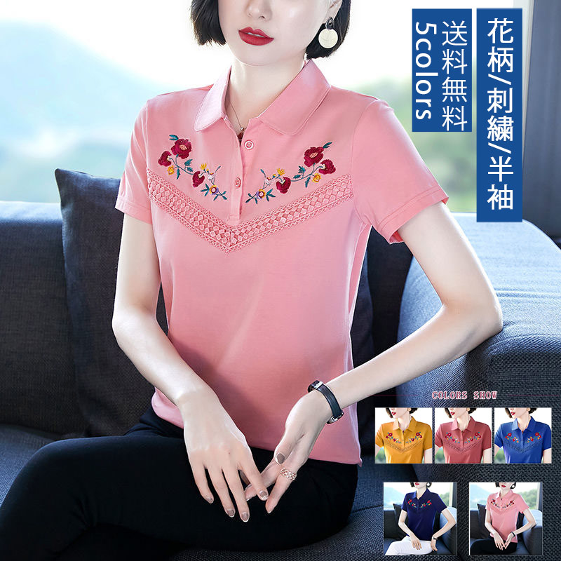 ポロシャツ レディース 夏Tシャツ 花柄 刺繍 折り襟 半袖 通気性 カジュアル 大きいサイズ 大人可愛い 普段使い アウトドア 夏服 おしゃれ