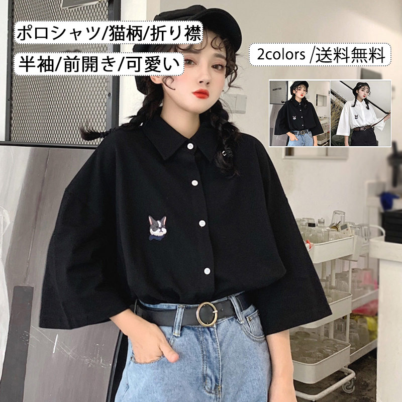 ポロシャツ レディース 夏Tシャツ 猫柄 折り襟 半袖 前開き トップス カジュアル 体型カバー ゆったり 可愛い 普段使い オフィス おしゃれ