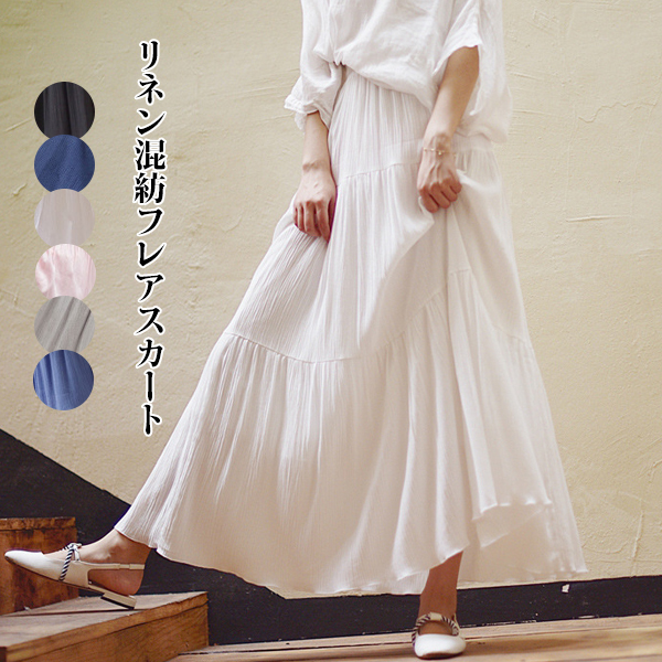 フレアスカート レディース プリーツスカート ドッキングスカート ロング丈 ギャザースカート マキシスカート リネン混紡 ウエストゴム