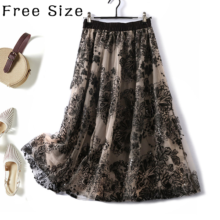 刺繍スカート 春秋 レディース フレアスカート 冬 ロングスカート ハイウエスト Aライン ウエストゴム ミモレ丈 ボトムス ボリューム