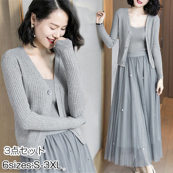 チュールスカート ロング レディース カーディガン 春 3点セット ニット セットアップレディースファッション ボトムス スカート