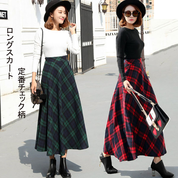 レディース 定番チェック スカート レトロ ロングスカート 着痩せ マキシ丈 ラインスカートレディースファッション ボトムス スカート