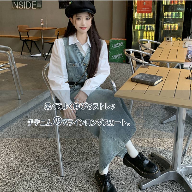 ロングスカート デニムベスト ジーンズベスト ノースリーブ レディース ボトムス デニムスカート フレアスカート レトロ ライン ブルー 春 秋 不規則 デザイン ポケット 無地 カジュアル おしゃ