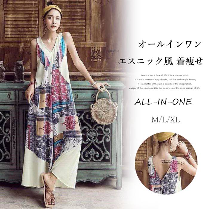 オールインワン エスニック風 ワイドパンツ レディース Vネック オーバーオール パンツドレス 結婚式 パーティードレス パンツ ロング丈 ノースリープ おしゃれ 夏 ファッション