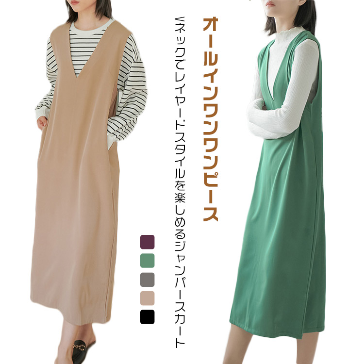 オフィスvネック 大人 ジャンパースカートネック ジャンスカ ミディアム レディース きれいめワンピース ショート丈 ワンピース 秋冬