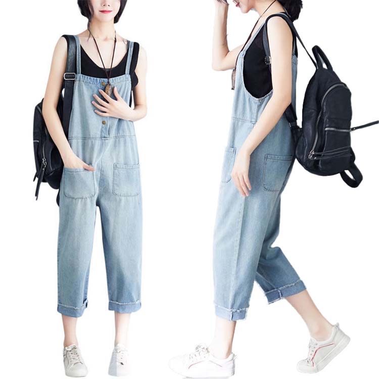 デニムサロペット オーバーオー オールインワン サロペット 夏 パンツ レディース ハーレムパンツ 九分丈 ゆったり 大きいサイズ 無地 ポケットあり 薄ブルー ハイウェスト