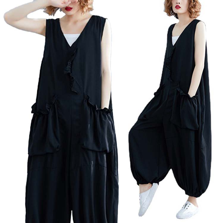オールインワン サロペット 夏 パンツ レディース 大きいサイズ 黒 vネック 無地 薄手 ゆったり サルエルパンツ オールインワン レディース 春夏 20代 30代 40代 オーバーオール