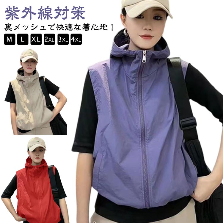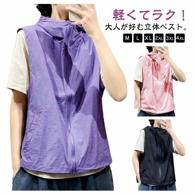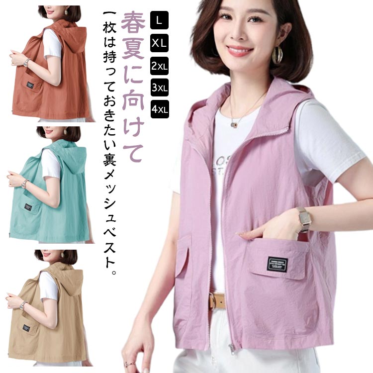 前開き ベスト レディース 裏メッシュ ポケット付き 大人 アウトドア 薄手 フード付き サマージャケット 羽織 ライトアウター