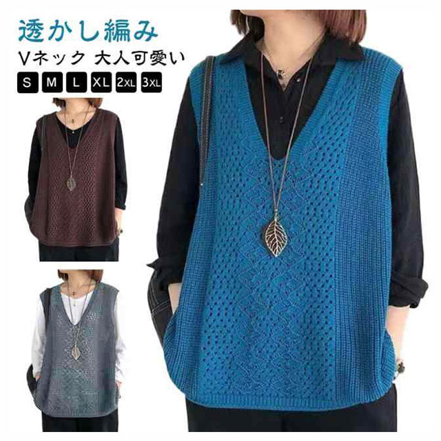 レディース ニットベスト Vネック ノースリーブ プルオーバー ケーブル編み 薄手 春 夏 秋 無地 ゆったり ミディアム ストレッチ カジュアル