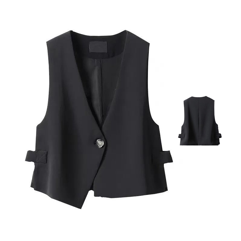 ショートベスト ショート丈 ベスト ノースリーブ ボタンベスト 前開き 無地 トップス 純色 ネックベスト