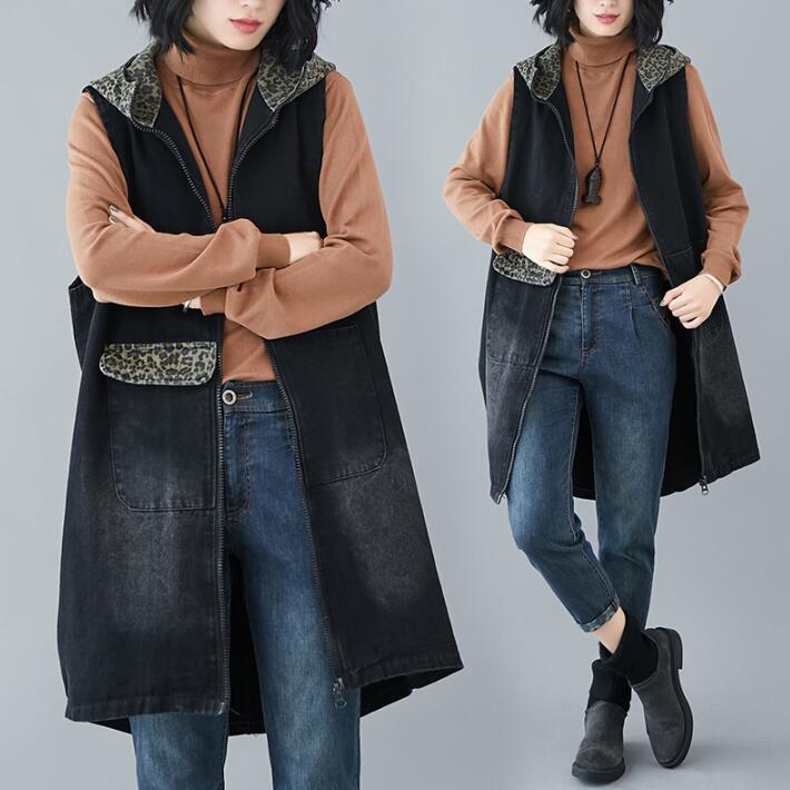 デニムベストデニムジャケットジージャン コートアウターレディース 大きいサイズヒョウレオパード フード付きノースリーブロング 長袖ゆったりカジュアル春秋L2L