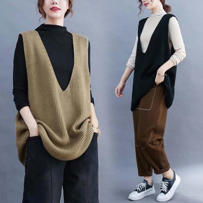ニットベスト レディースロングニット畦編みノースリブコーディネート重ねきスリットロングベストVネックセーター切替大きめ体型カバー 春秋