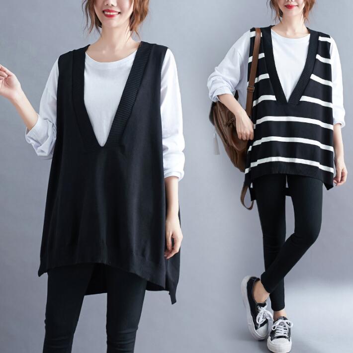 ニットベスト レディース前後差ボーダーノースリブコーディネート重ねきスリットロングベストVネックセーター切替大きめ体型カバー 春秋