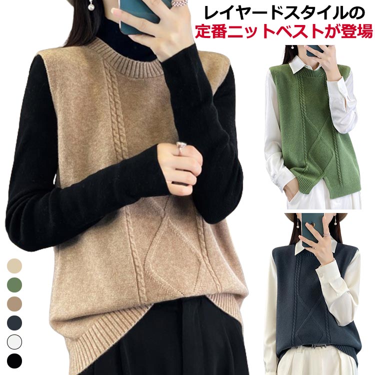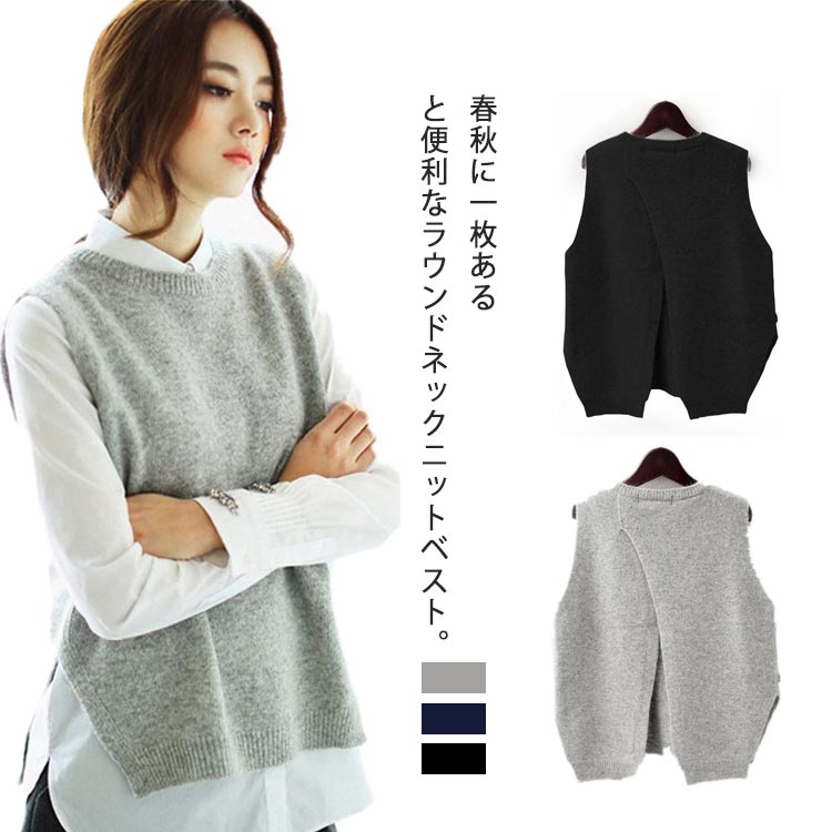 着まわし効く ニットベスト バックスリット プルオーバーベスト ラウンドネック ニット ベレディースファッション トップス ベスト ジレ