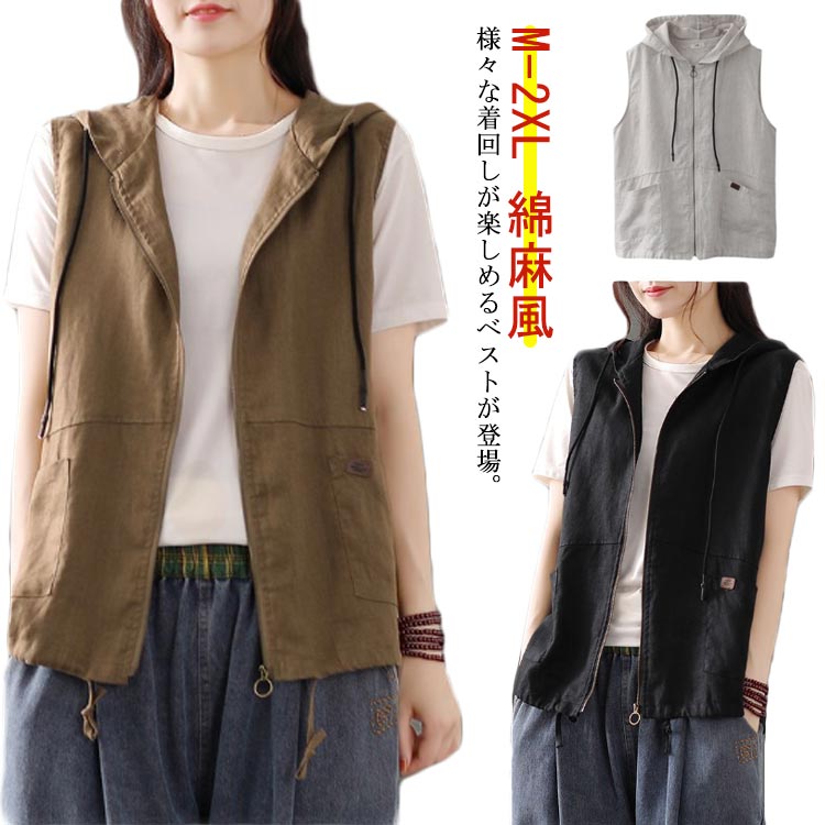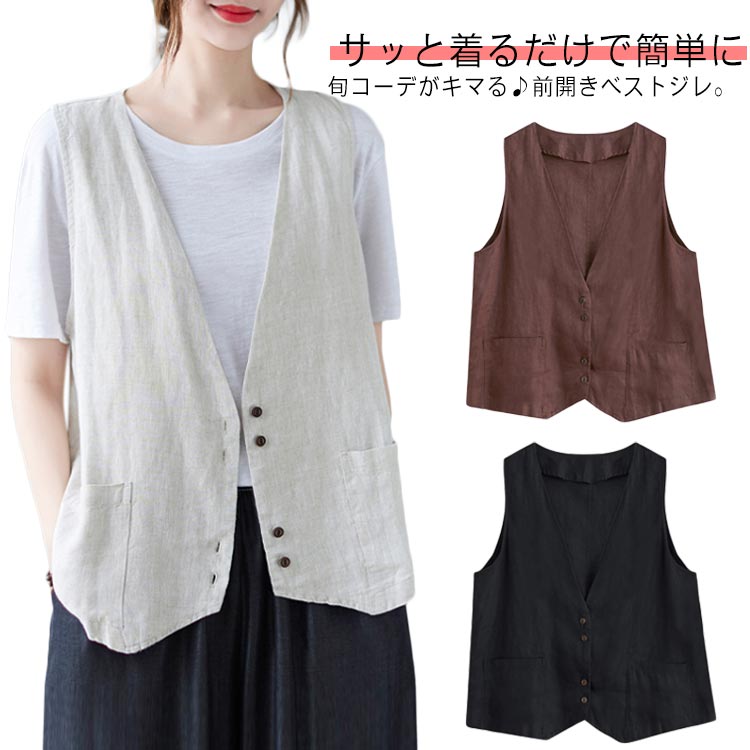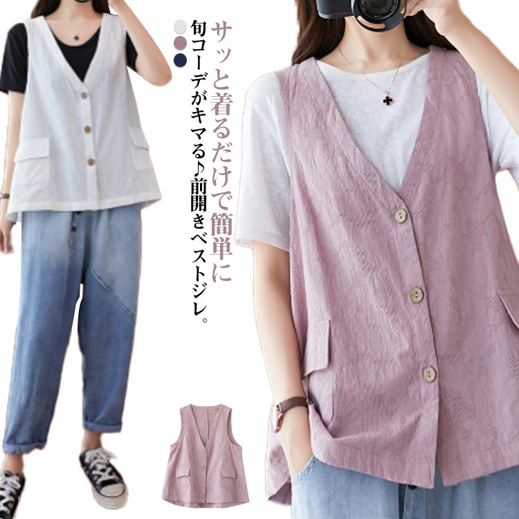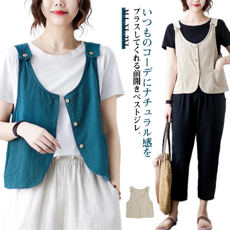 ベスト ジレ 綿麻 前開き 春夏 レイヤード 羽織り 重ね着 レディース 夏ベスト サレディースファッション トップス ベスト ジレ