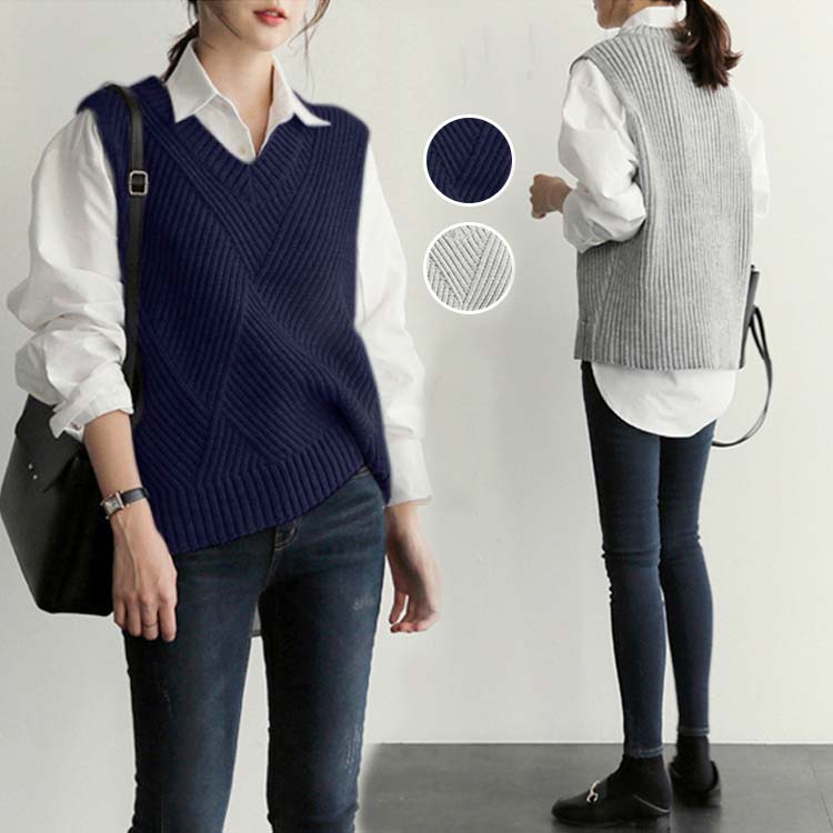 ニットベスト レディース Vネック ノースリーブ 編み柄 ショート丈 韓国風 重ね着 ニットセーター グレー ネイビー スクールベスト
