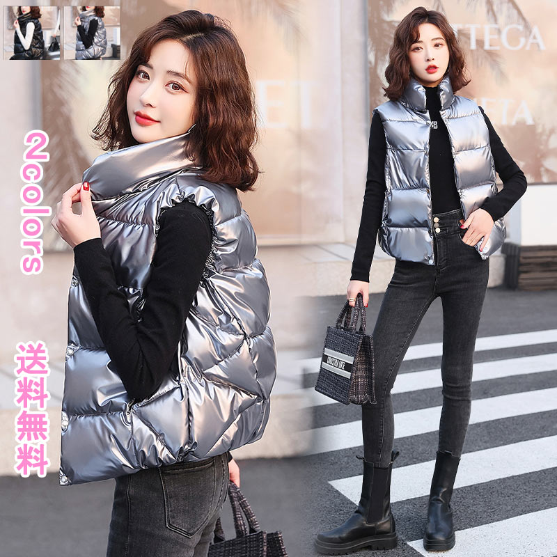 真冬はインナーダウンとして 光沢感あり 中綿ベスト ショート丈ベスト 秋冬 防寒 保温レディースファッション トップス ベスト ジレ