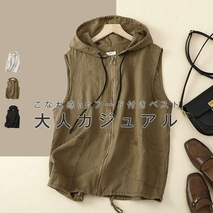 ベスト レディース 春夏 前開き きれいめ フード付き コート お洒落 綿麻風 ノースリーブ トップス パーカー 無地 大人 着まわし カジュアル プルオーバー 着痩せ お洒落 普段着 重ね着 通勤