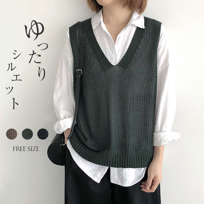 重ね着風 Vネック 透かし編みベスト Summer Vest ブラウン グリーン ブラック ベージュ 黒 緑 茶 20代 30代 40代 50代 フリーサイズ F 体型カバー ♪