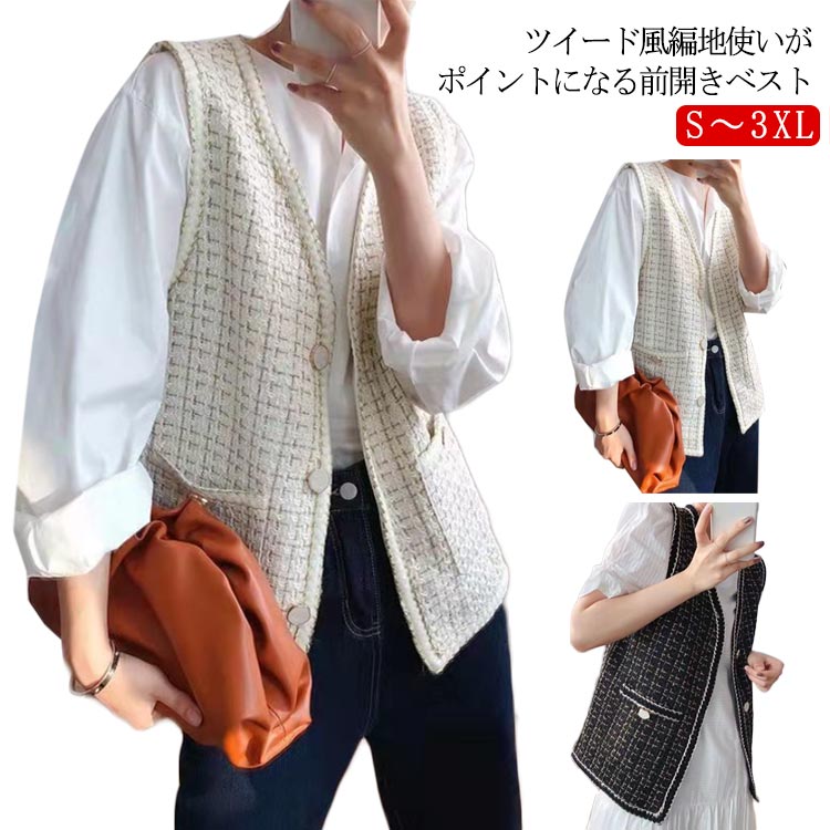 ベスト オフィス レディース ロングベスト ネック ジレ 前開き ノースリーブ ツイード風 羽織 カーディガン 大人 秋冬