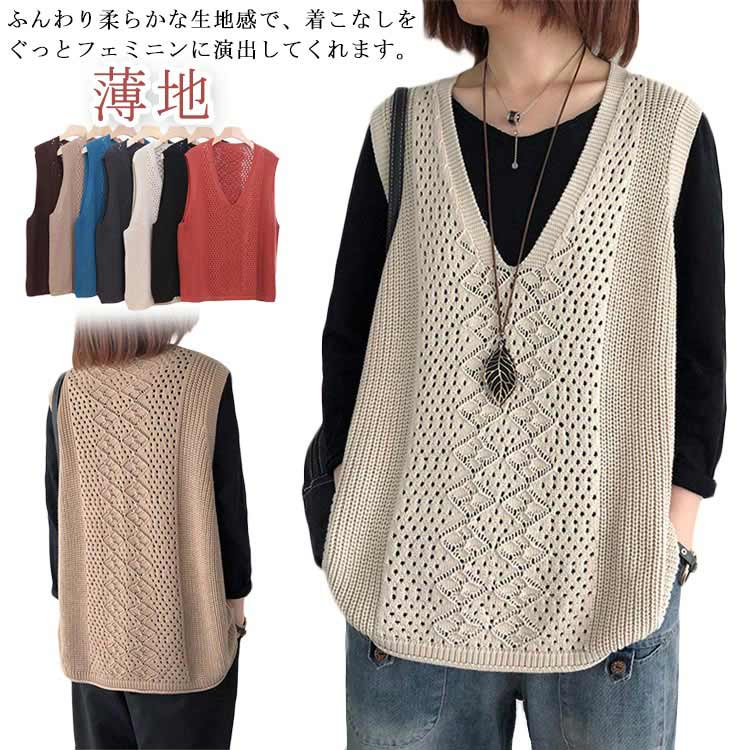 ゆったり ニットベスト レディース 秋 ノースリーブ ケーブル編み プルオーバー 春 夏 vネック 無地 薄地