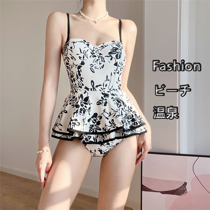 水着 レディース オールインワン セクシー ワンピース オトナ女子 パッド付き 小胸 バスト カバーアップ かわいい 水着 花柄 体型カバー水着 2点セット 大きいサイズ おしゃれ ビーチ 海水浴 可