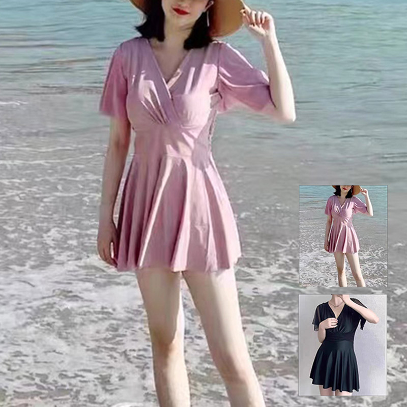 ワンピース水着 2点セット 体型カバー水着 レディース オールインワン 水着 トップス かわいい 無地 おしゃれ 大人 露出控えめ Vネック ノンワイヤー リボン 女の子